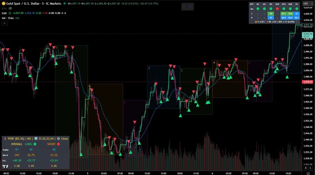 The system’s momentum-based signals catch trend formations early through the proprietary SUN line algorithm.